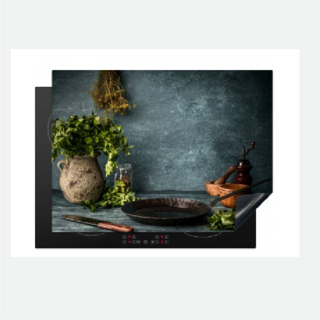 Een rustieke tafel in de keuken is gedecoreerd met een gietijzeren pan en een aantal andere dingen die essentieel zijn in de keuken. De vaas is gevuld met kruiden die slap naar beneden hangen. Dit beeld past perfect in de keuken.