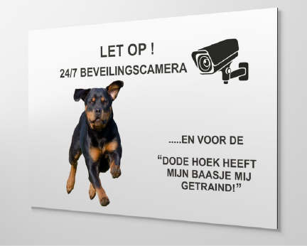 De meeste van onze waak- en stalborden worden bedrukt op aluminium dibond of aluminium. Deze materialen zijn stevig, duurzaam en weerbestendig, waardoor de borden zowel binnen als buiten lang mooi blijven. Daarnaast geven ze een strakke en professionele uitstraling. Klanten kiezen vaak voor een stijl met een eigen foto van hun huisdier, maar ook creatieve bewerkingen of speelse ontwerpen zijn populair. Zo ontstaat altijd een bord dat niet alleen praktisch is, maar ook echt in het oog springt.